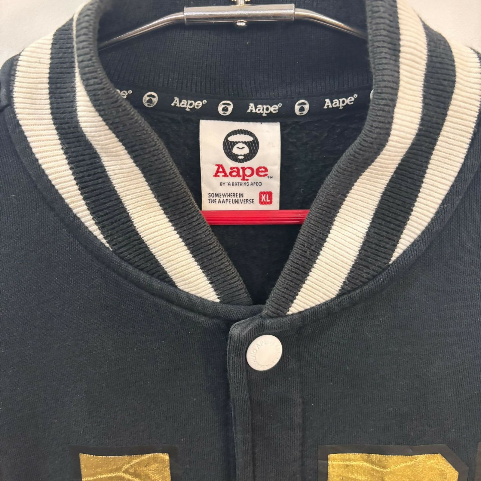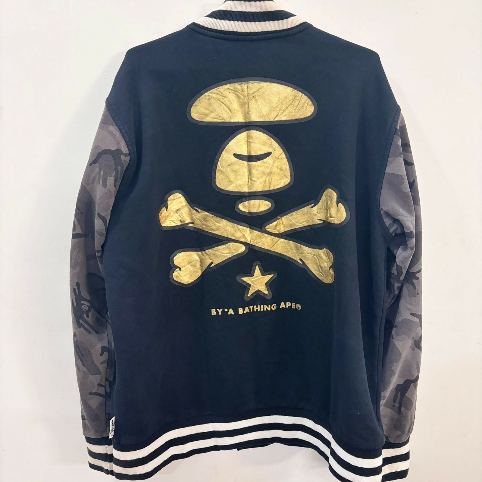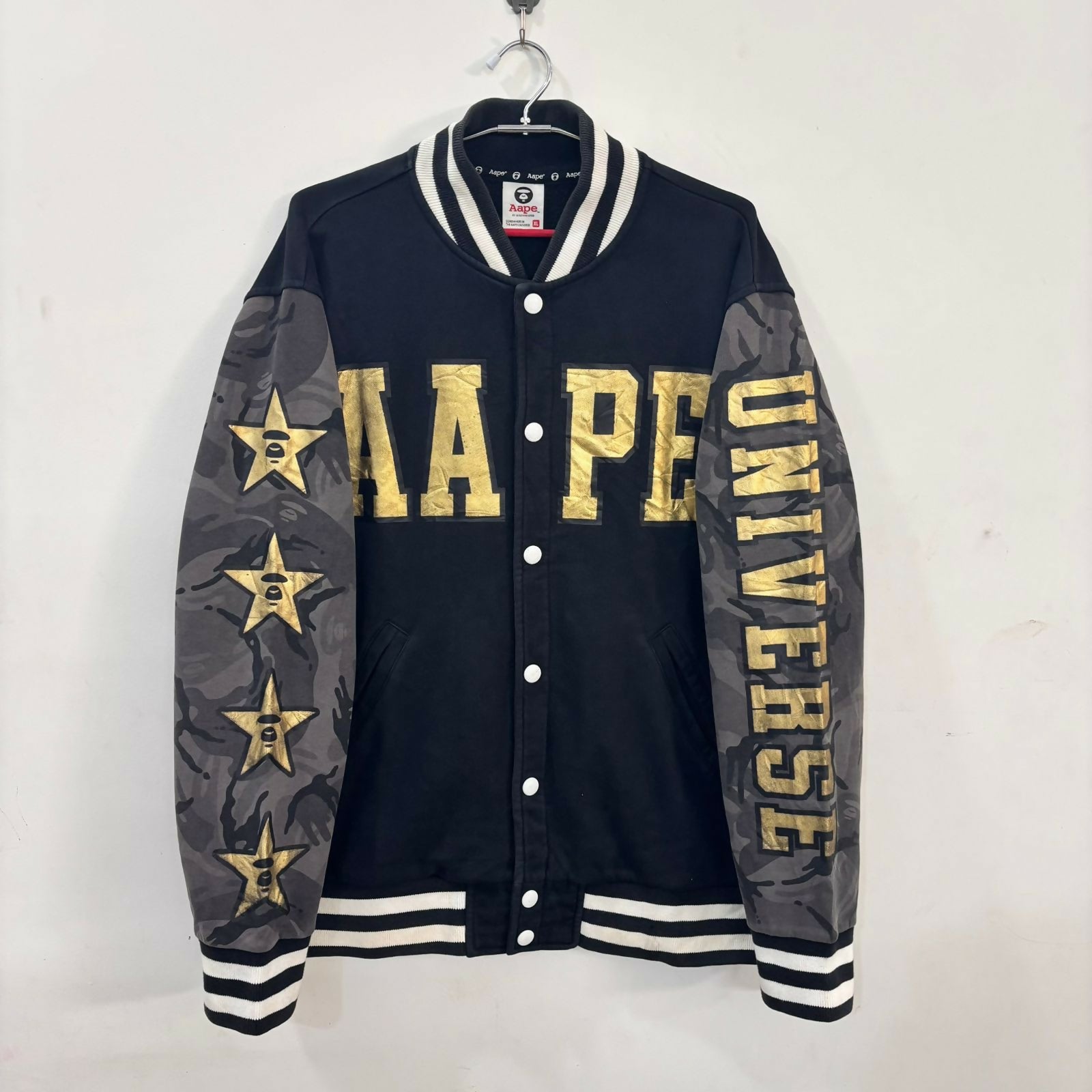 This AAPE varsity jacket features a distinctive design with a black body and grey camouflage sleeves. Key details include:Brand: AAPE...