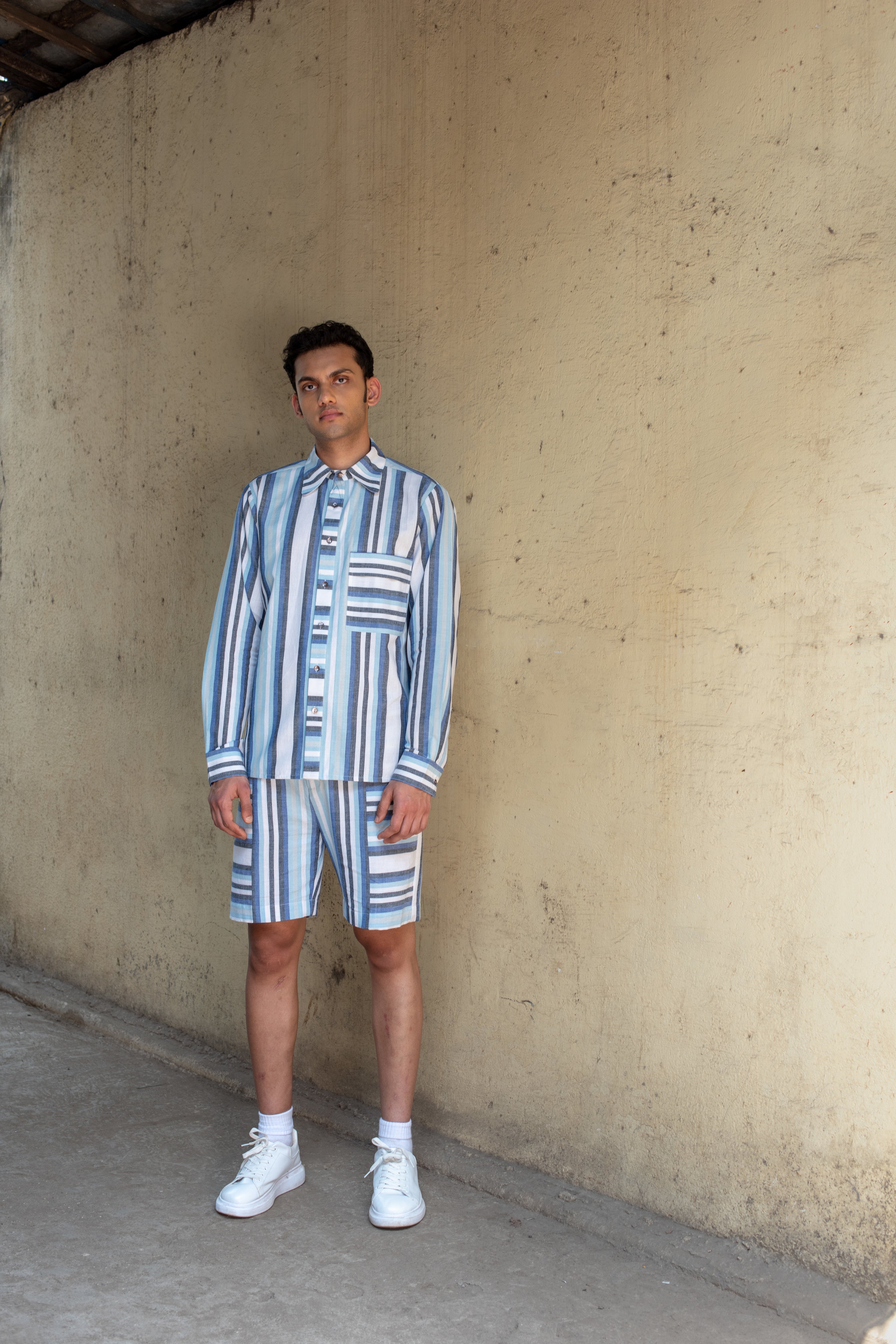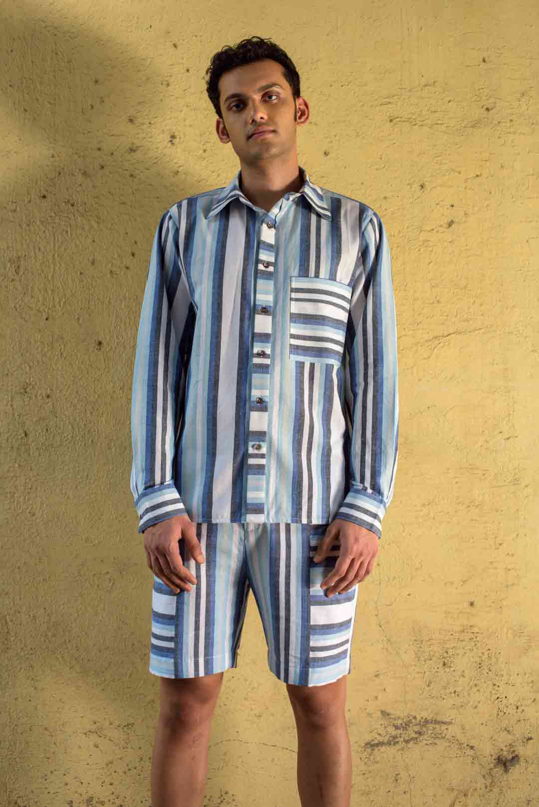 Description: Feel fresh in this cotton striped shirt with a twisted placket and curved collar edges. Regular shirt sleeves. Patch...