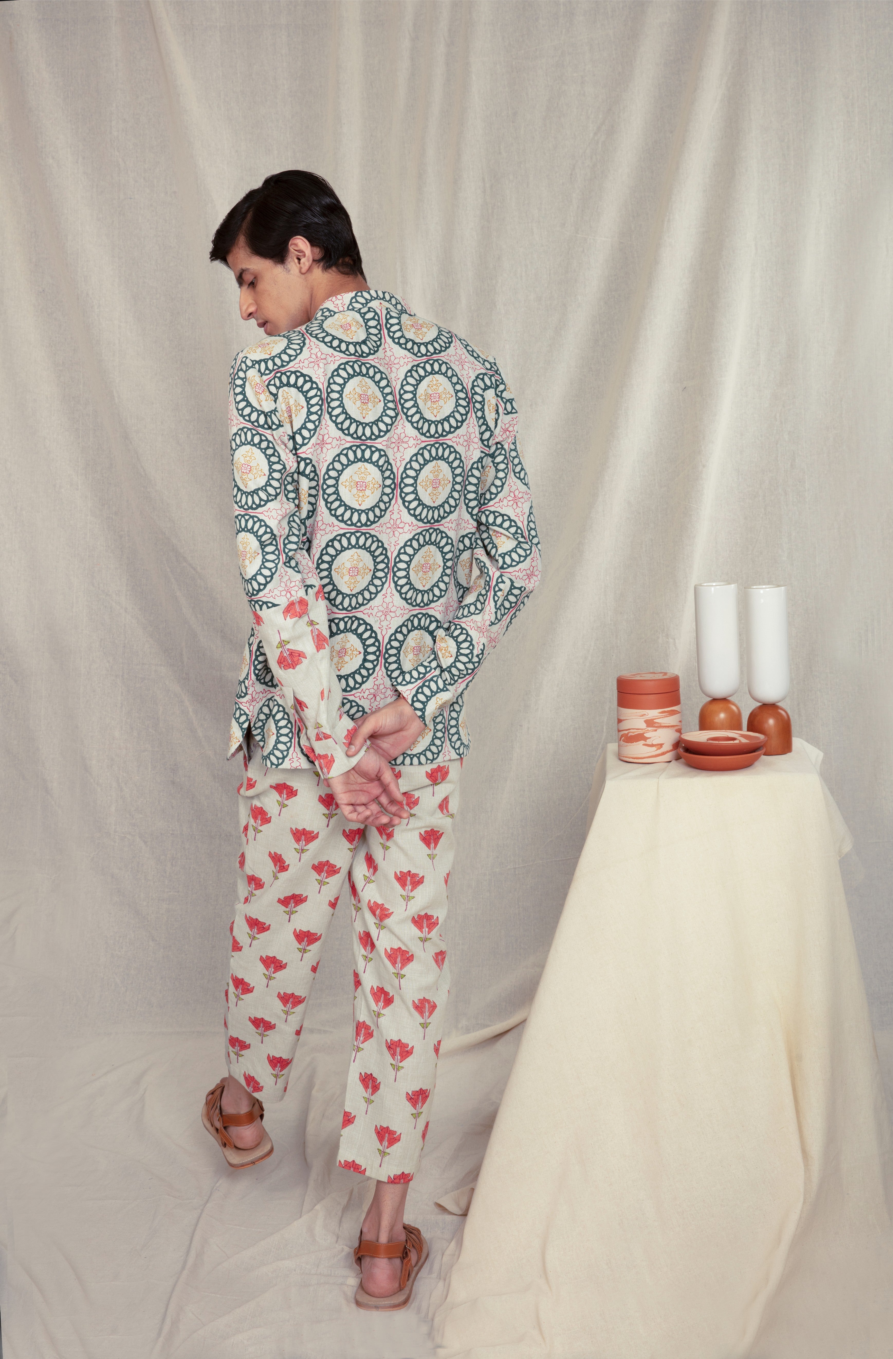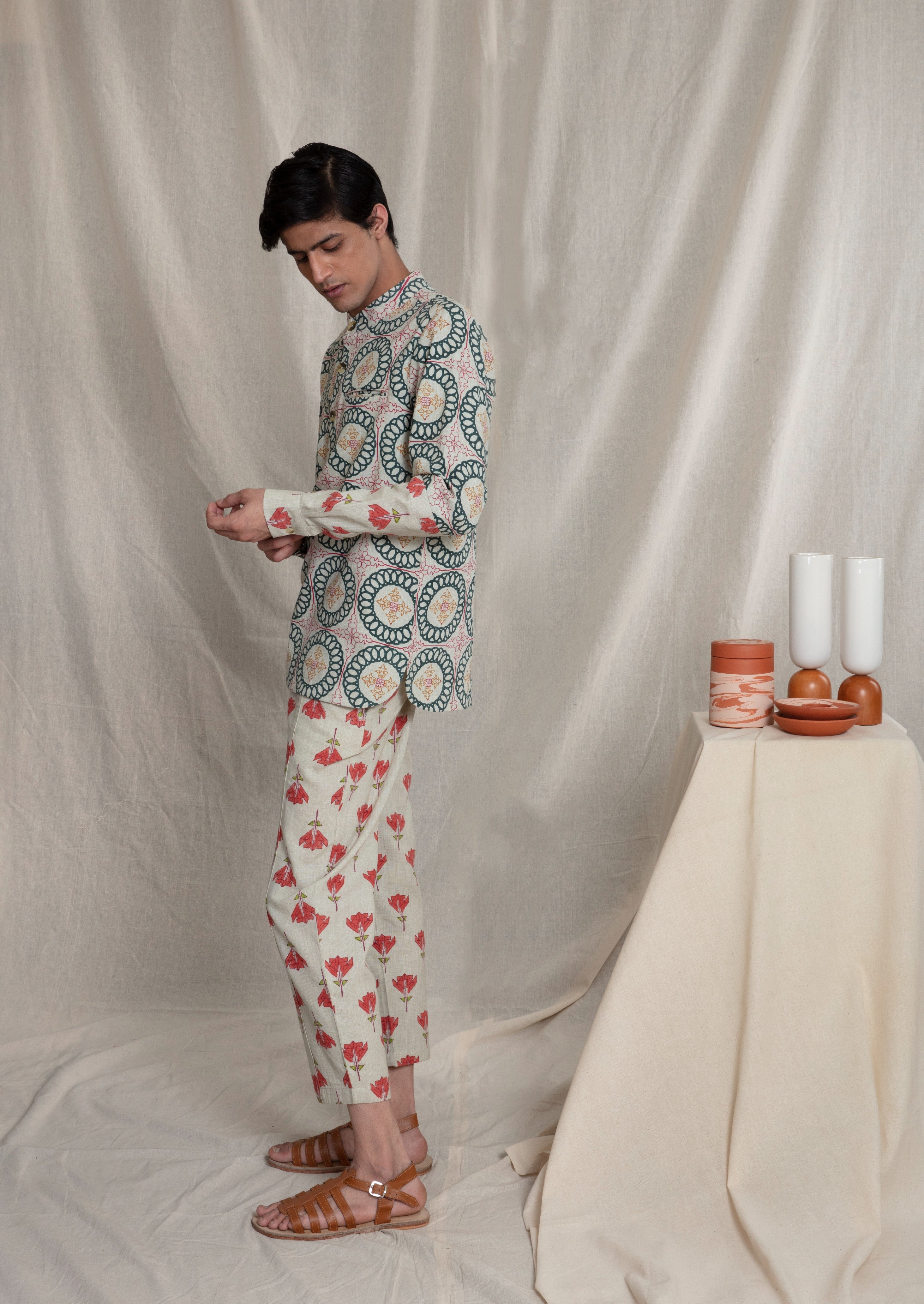 Description: Featuring a wide mandarin collar and half placket, this shirt is handcrafted in our tile print and is effortless to style. The rose print sleeve detail and rounded hems are noteworthy. It is a perfect combination of a traditional silhouette and fun print.