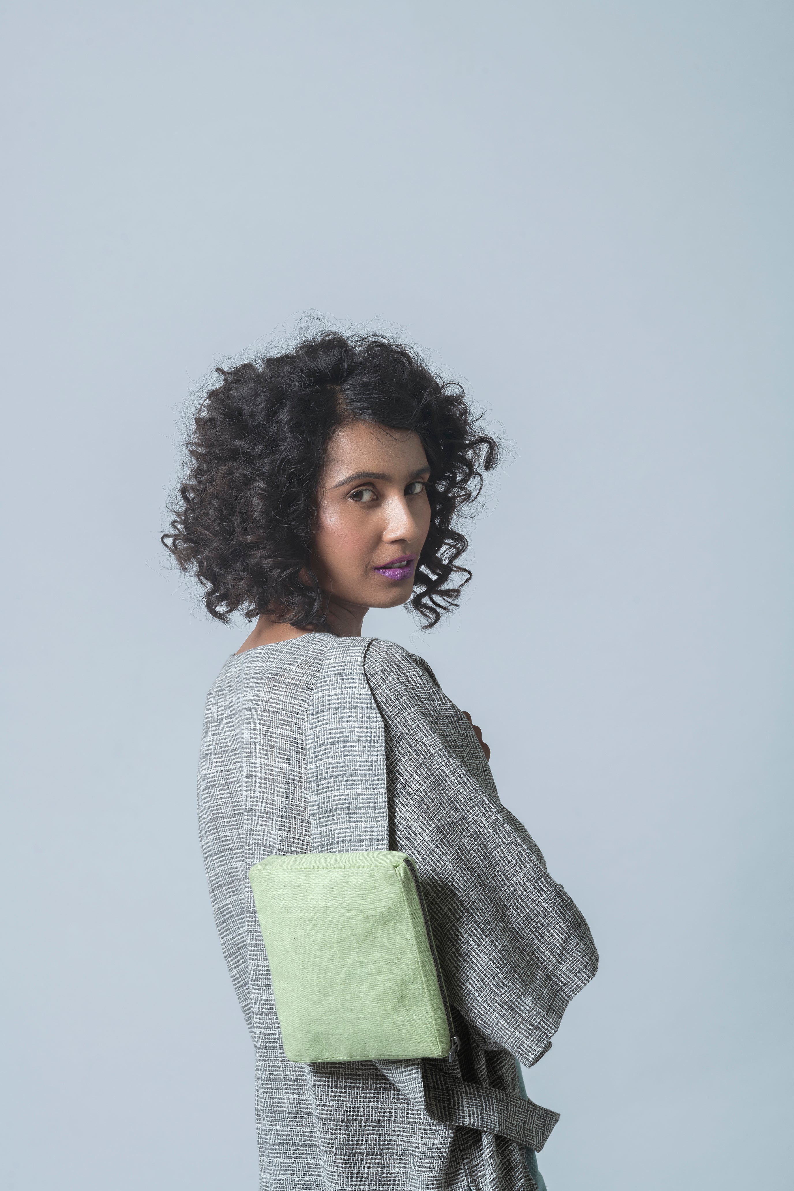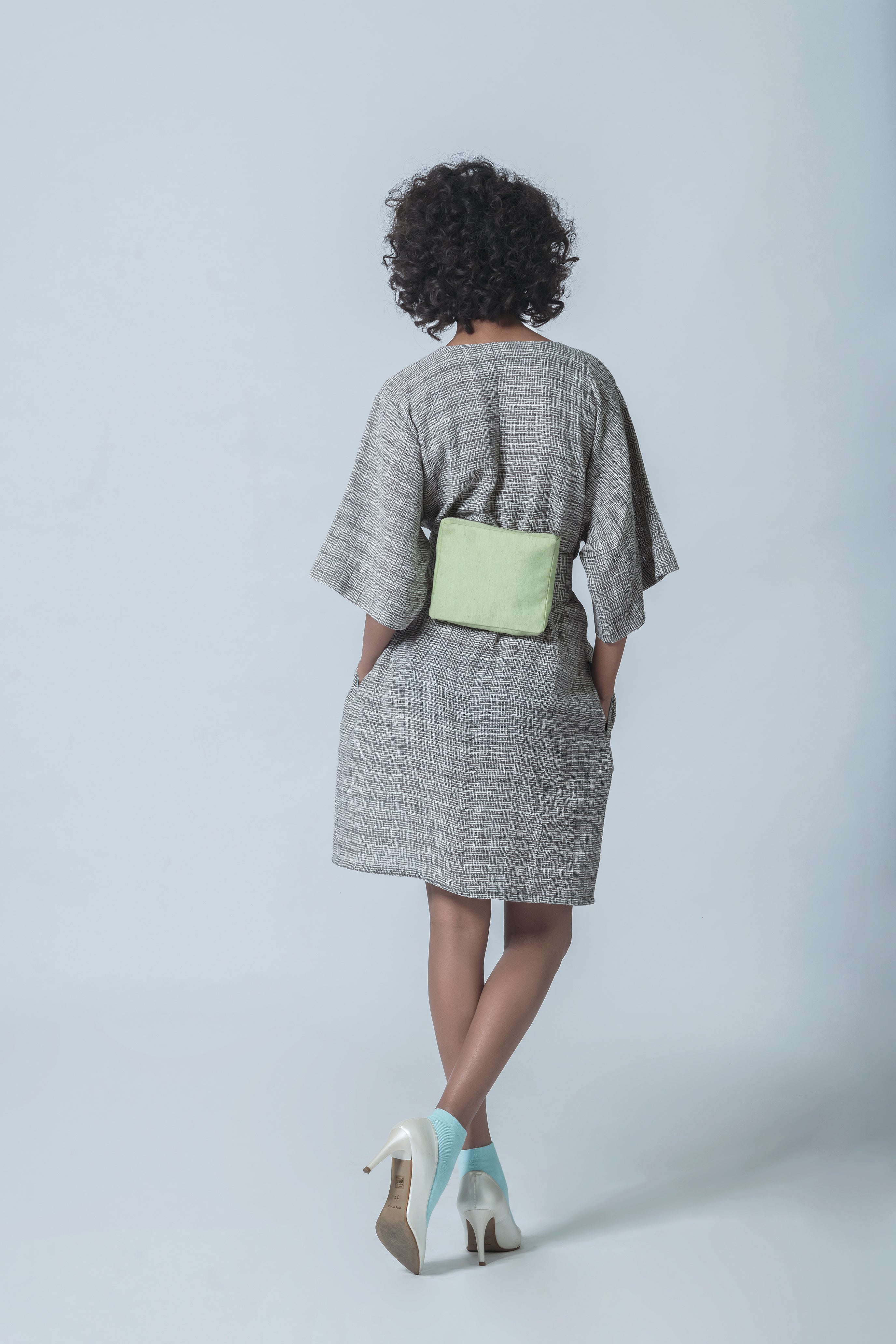 Description: With both sleeves constructed differently, this little off the body and square form silhouette will make you soar. It will be a favorite to those with an eye for detail. Playing around the 'full stop' form of punctuation in aqua handloom cotton using reverse appliqué; adds the perfect dash of style.