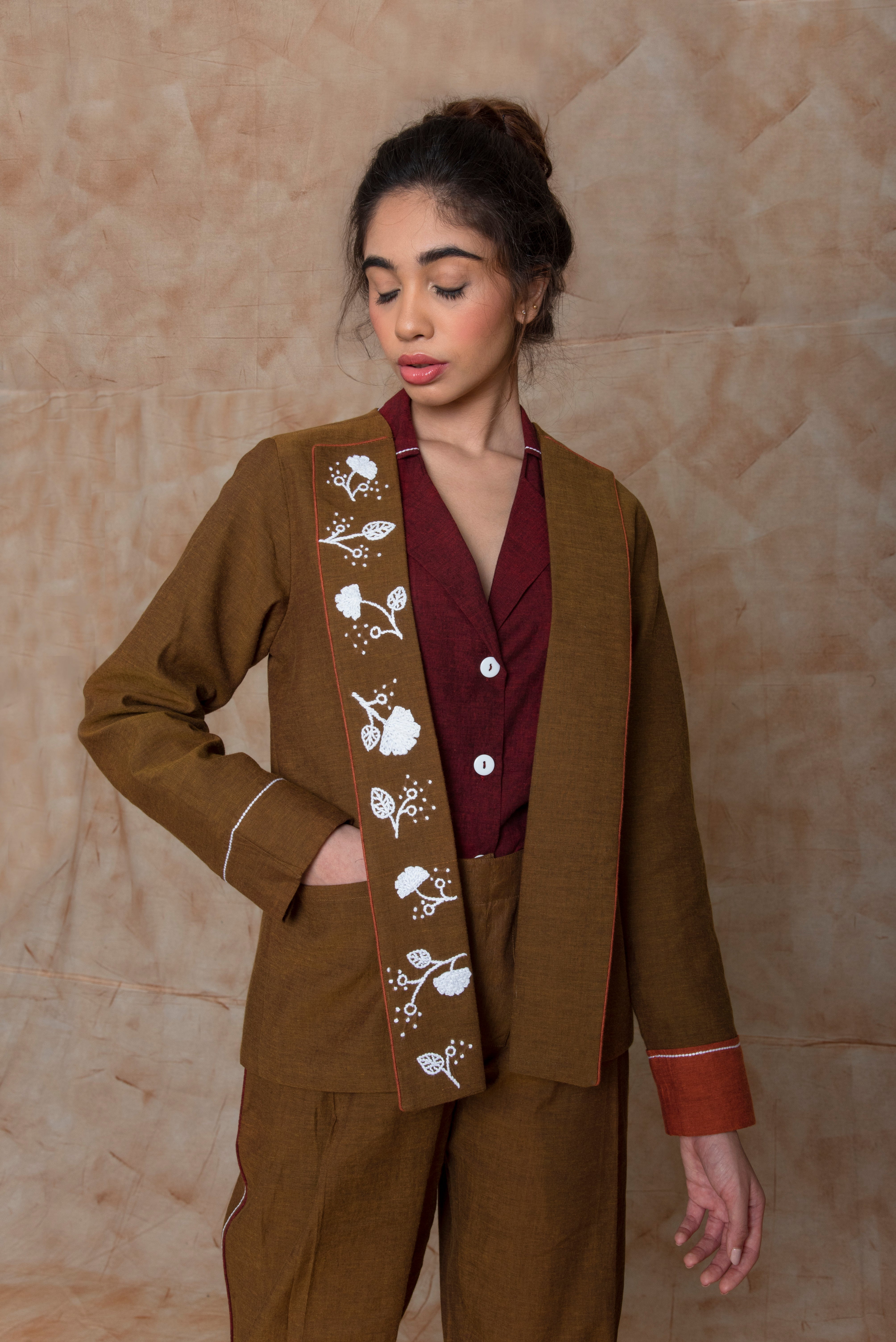 Modern tailored jacket with an extended lapel, no buttons, asymmetric embroidery and back vent. Structured shape for day to night....