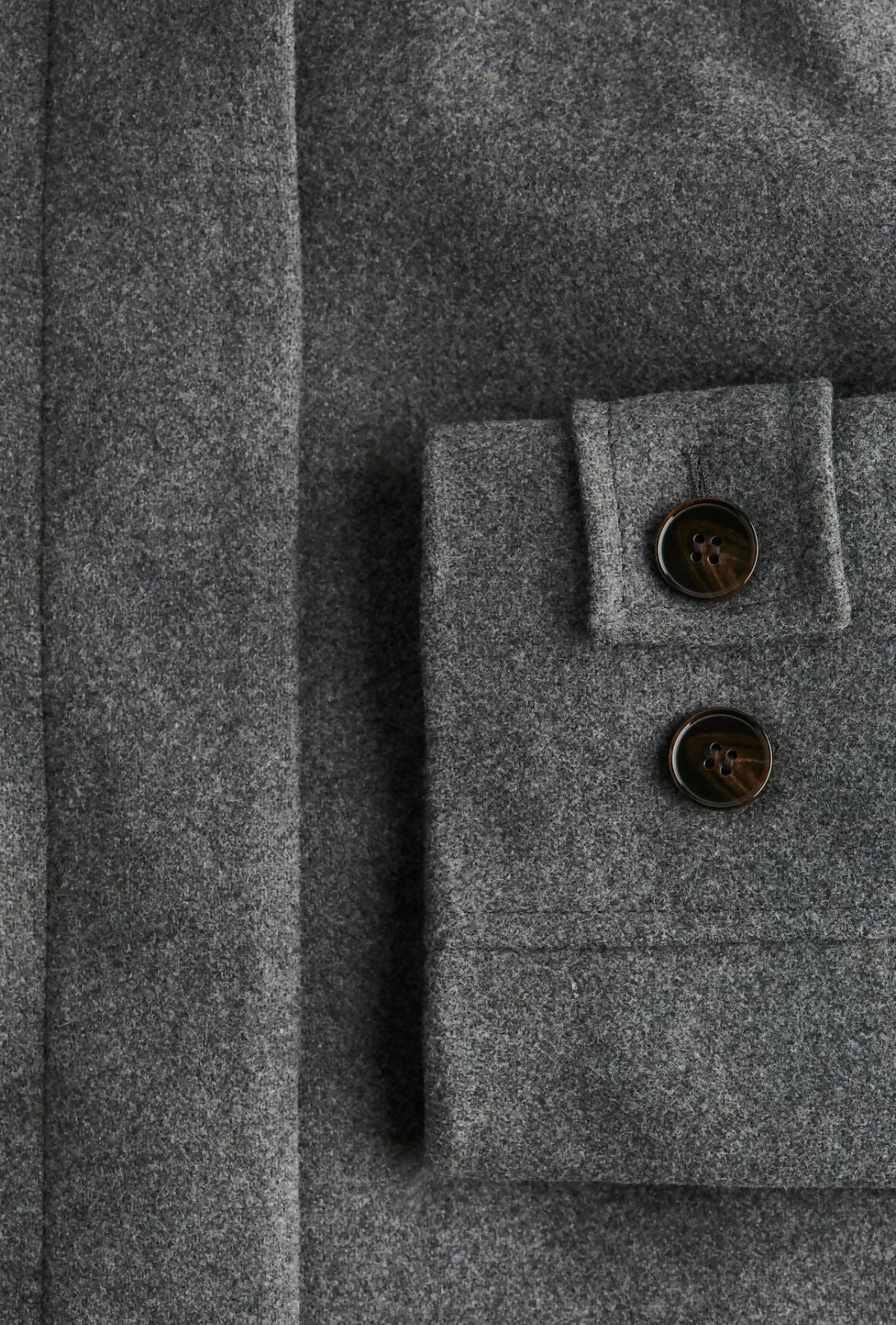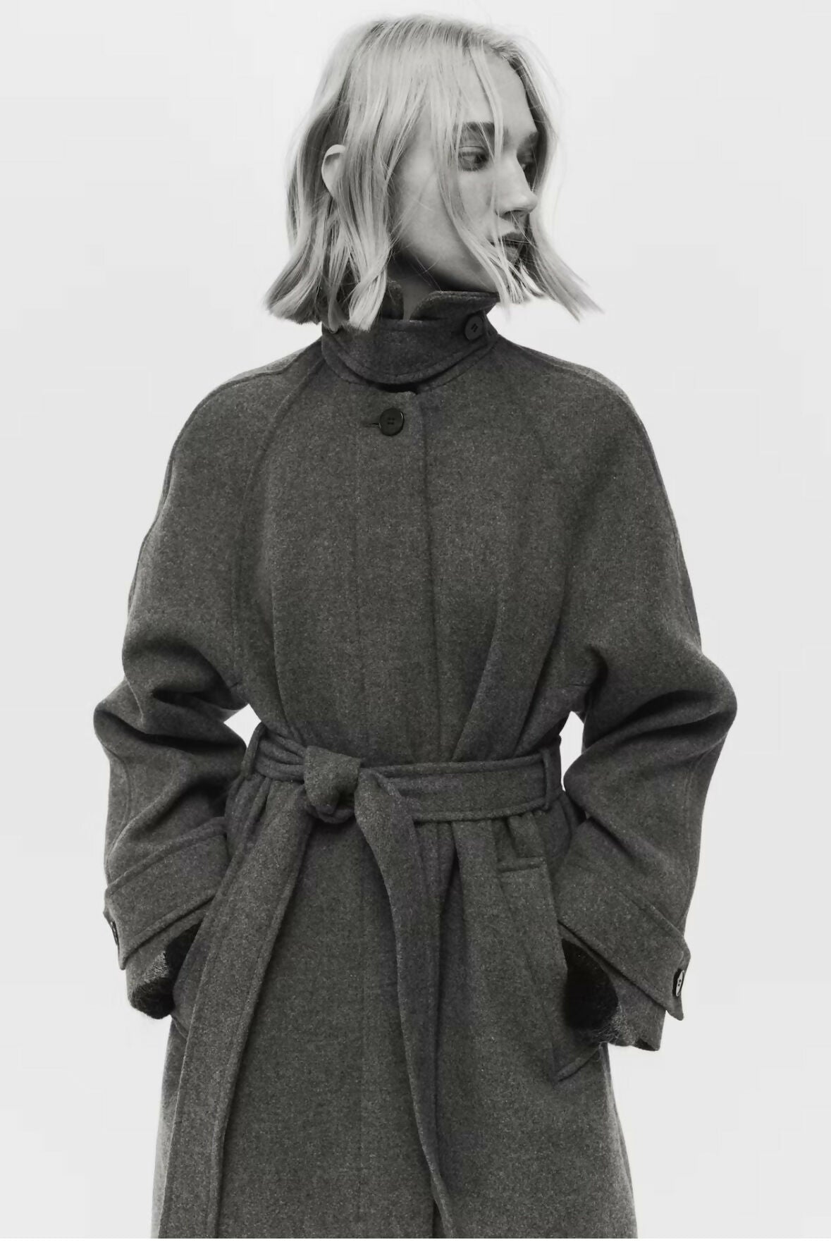 Dark grey marl tie belt knee-length coat in felted twill containing wool.Collar, throat latch, visible button at the top and...
