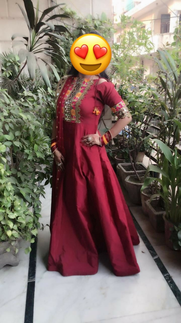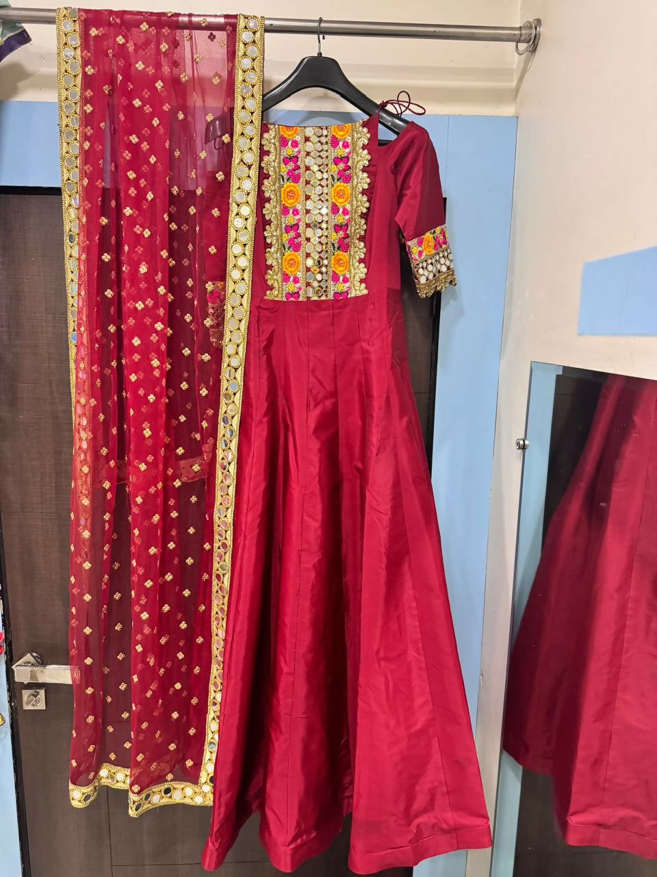 Beautiful floor length anarkali suit in semi silk fabric with designer neckline adorned with mirror work laces and comes with...