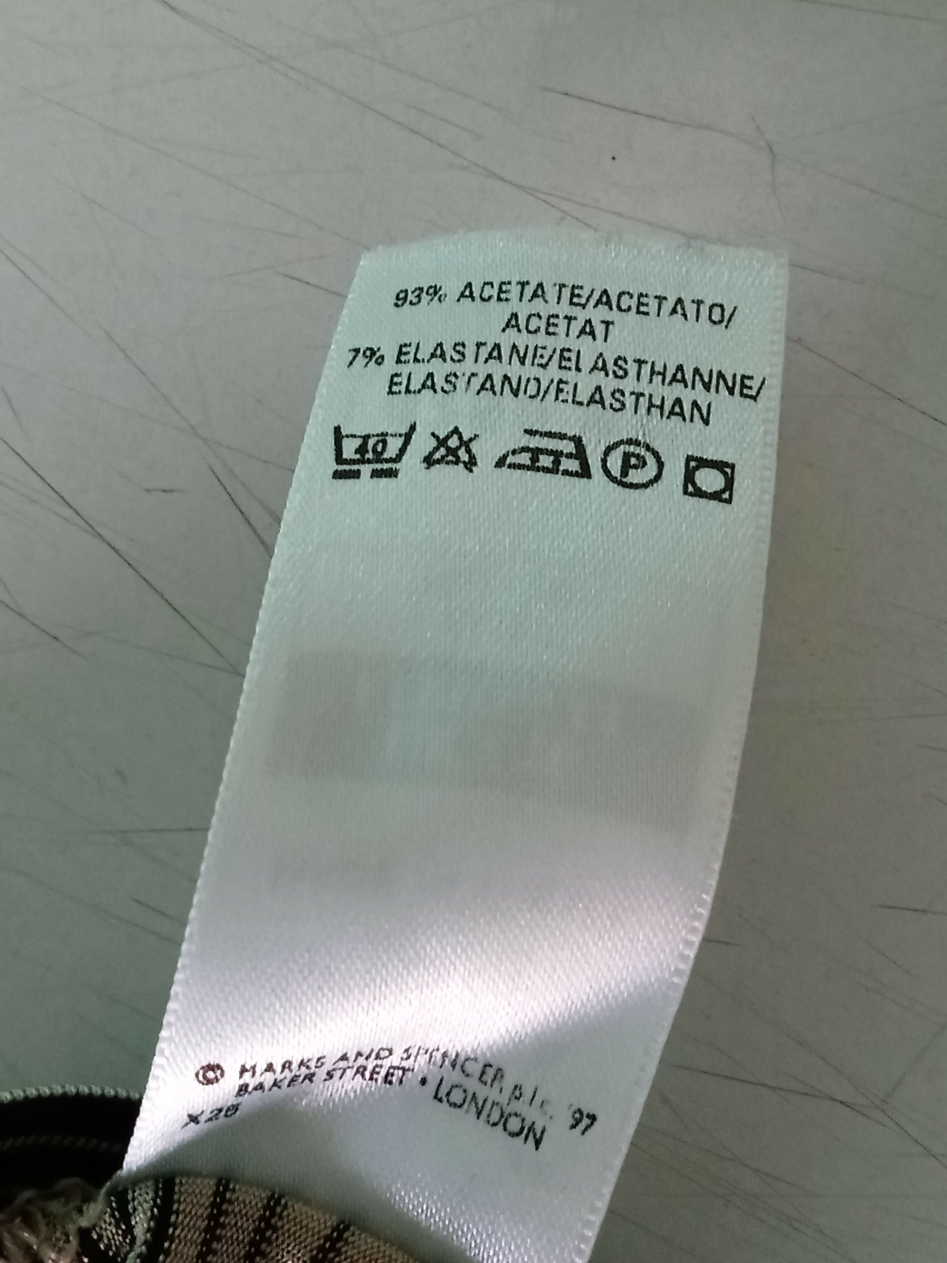 Dark beige and black patterned stripe. It is really delicate. The length is short but not cropped. Really nice fabric...