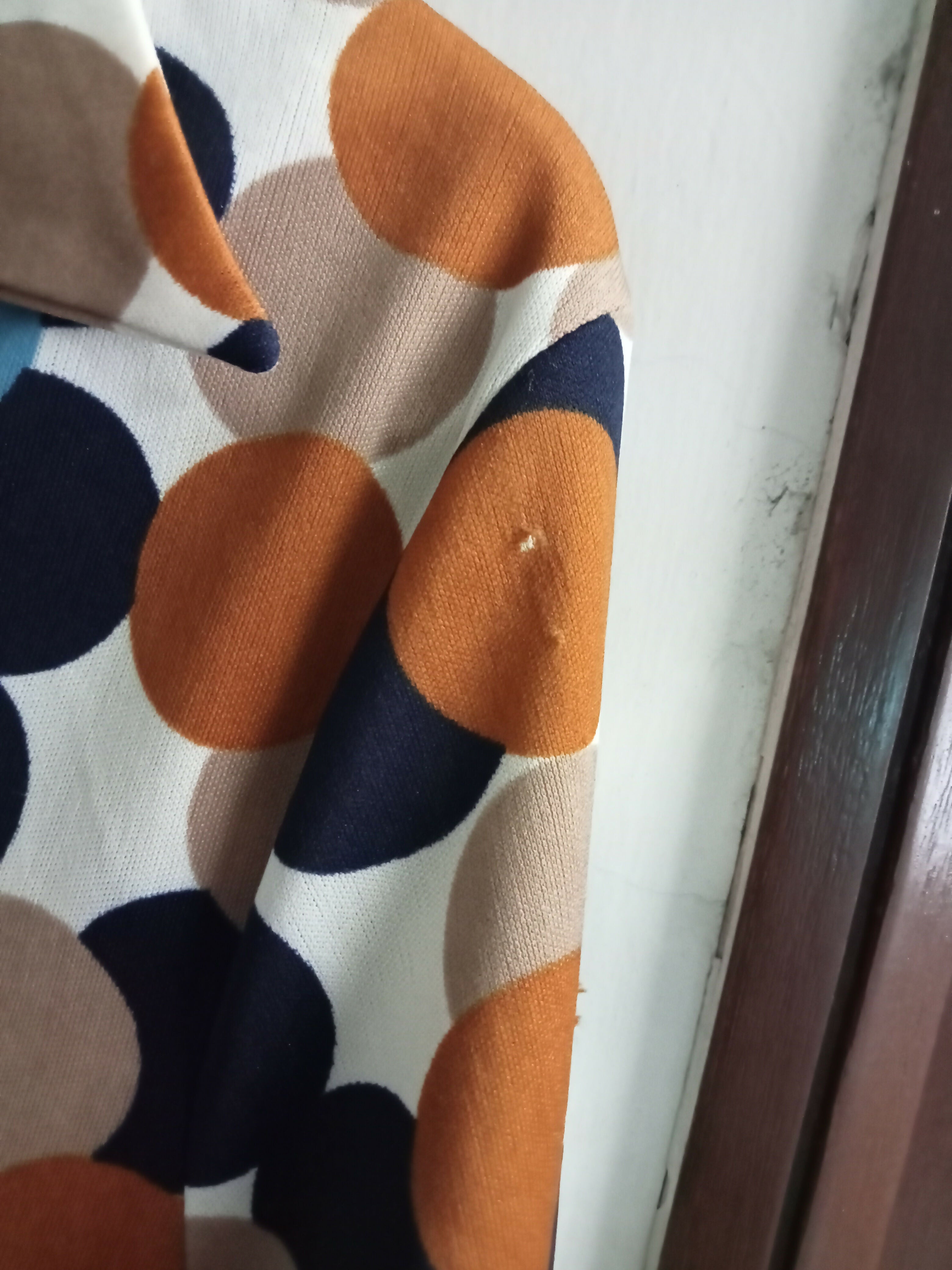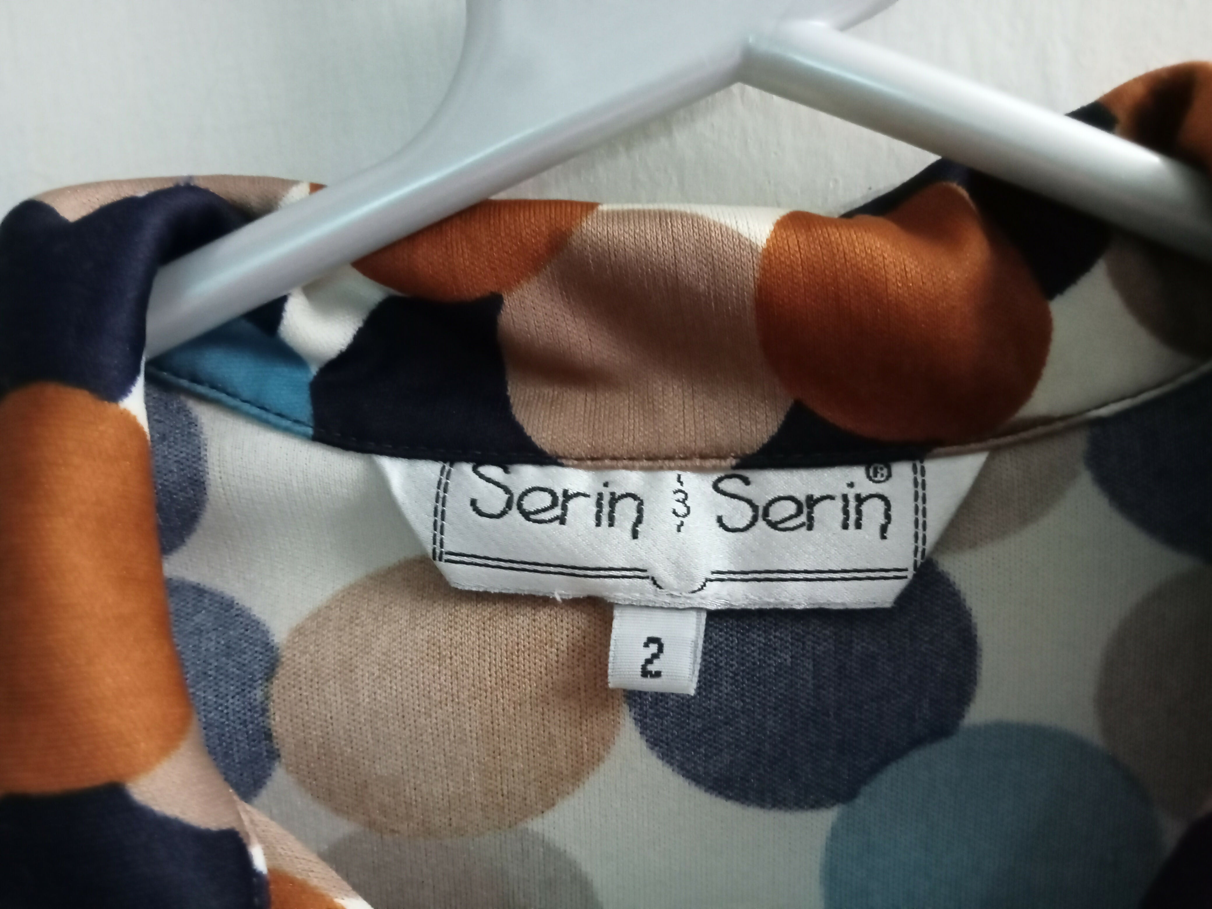 It features a partial zip up front and a collar. It belonged to my mum. She bought it at a store on a London trip in the late 90s. It has a light fabric texture not silk or satin. It has a label that says Serin and serin, and a size 2. It also has a tag on the inside of the shirt that says made in Turkey. I tried looking up the label but couldn't find anything. It is in good condition except it has a few snags on one of the sleeves, you can see it in the photos. It has no fabric tag or washing instructions.