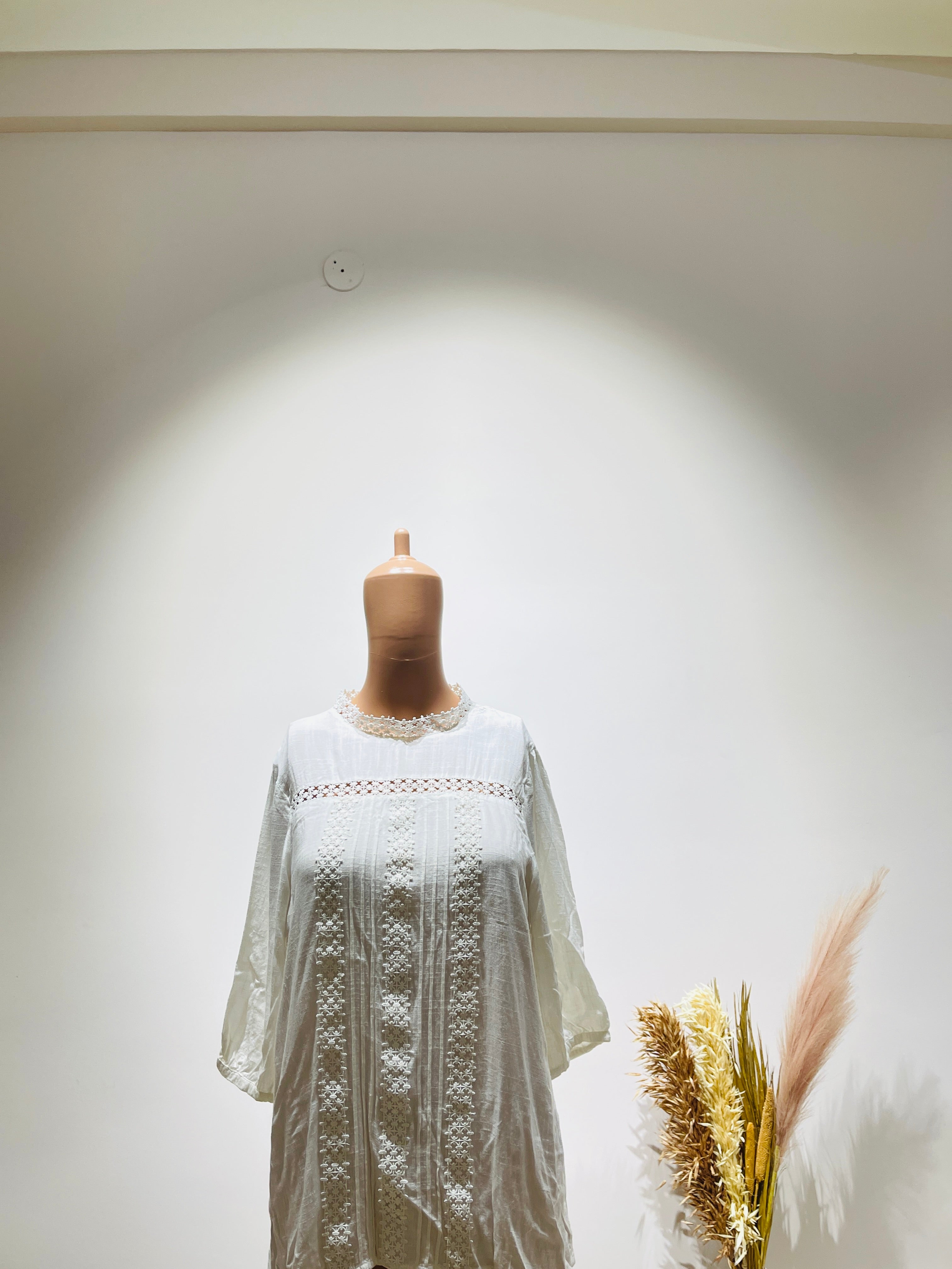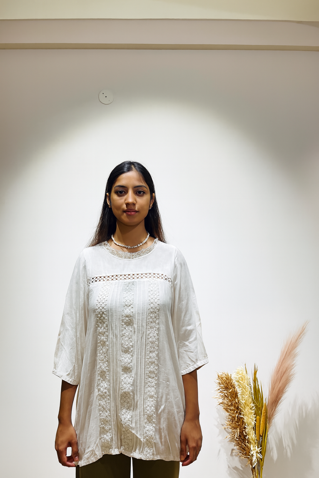 A graceful white embroidered cotton ethnic top, blending traditional charm with modern comfort for any occasion Chest - 38 inch...