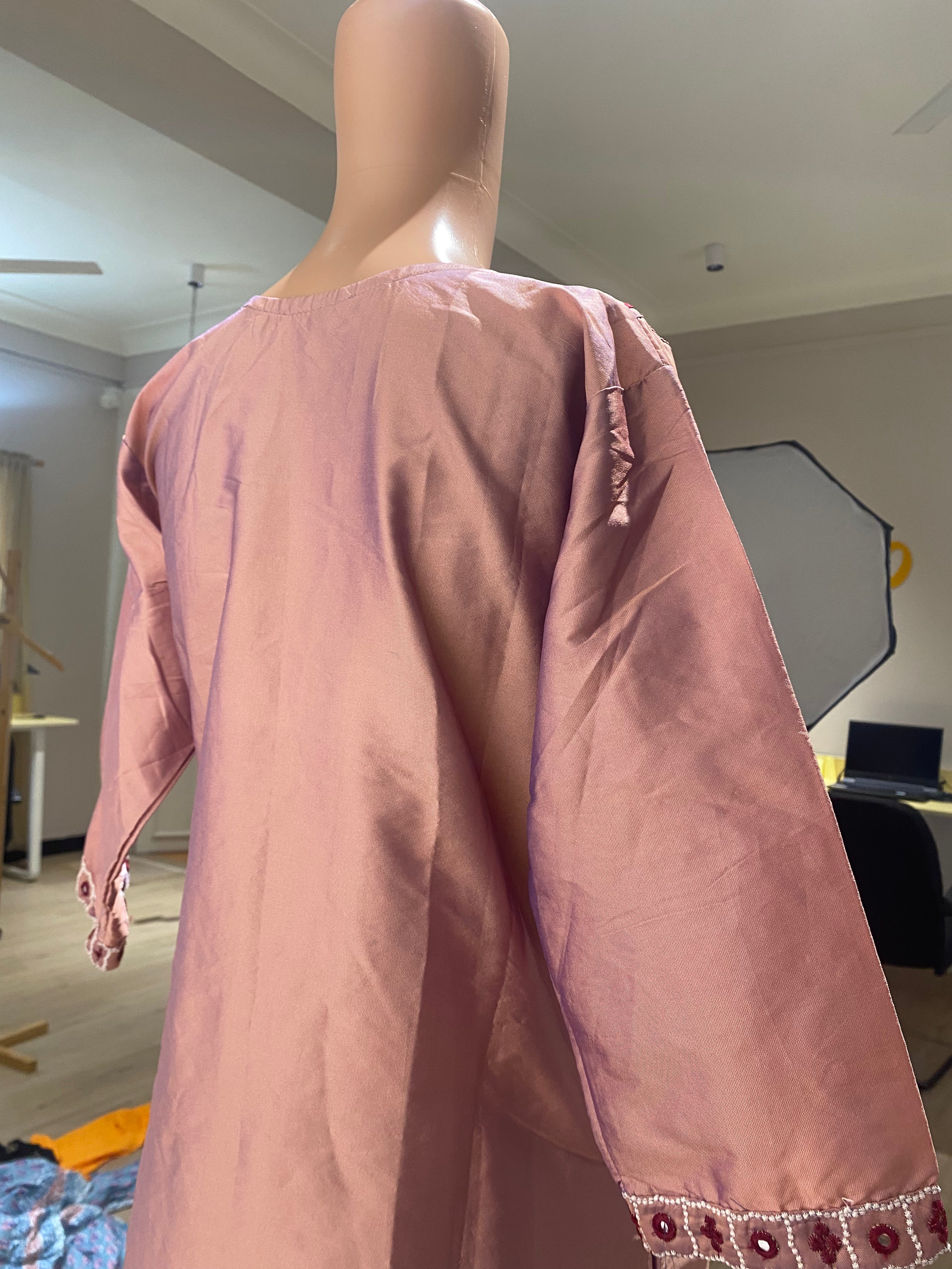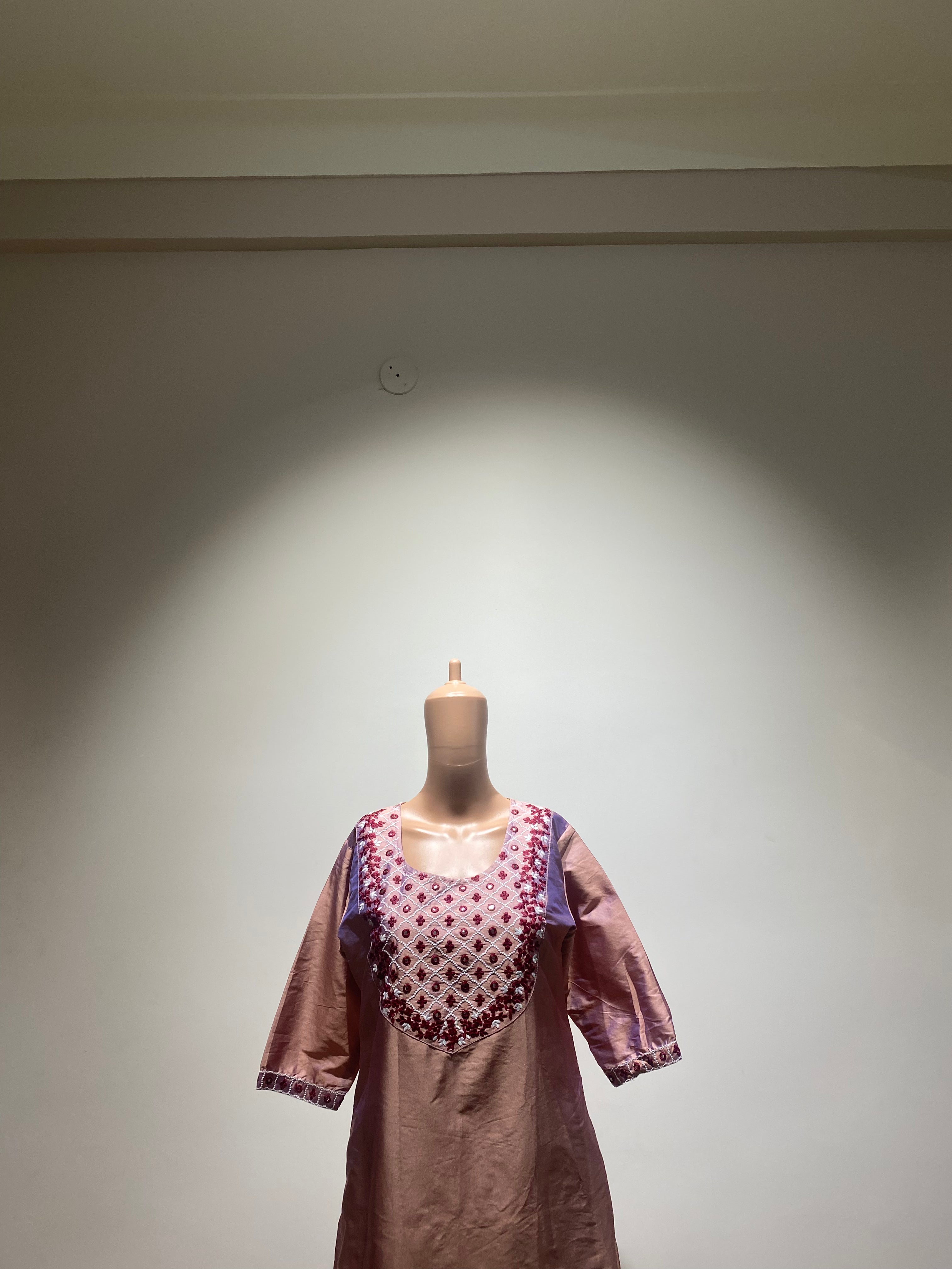 Women's Art Silk Embroidery Straight Rose Gold Kurta & Pant - L Size