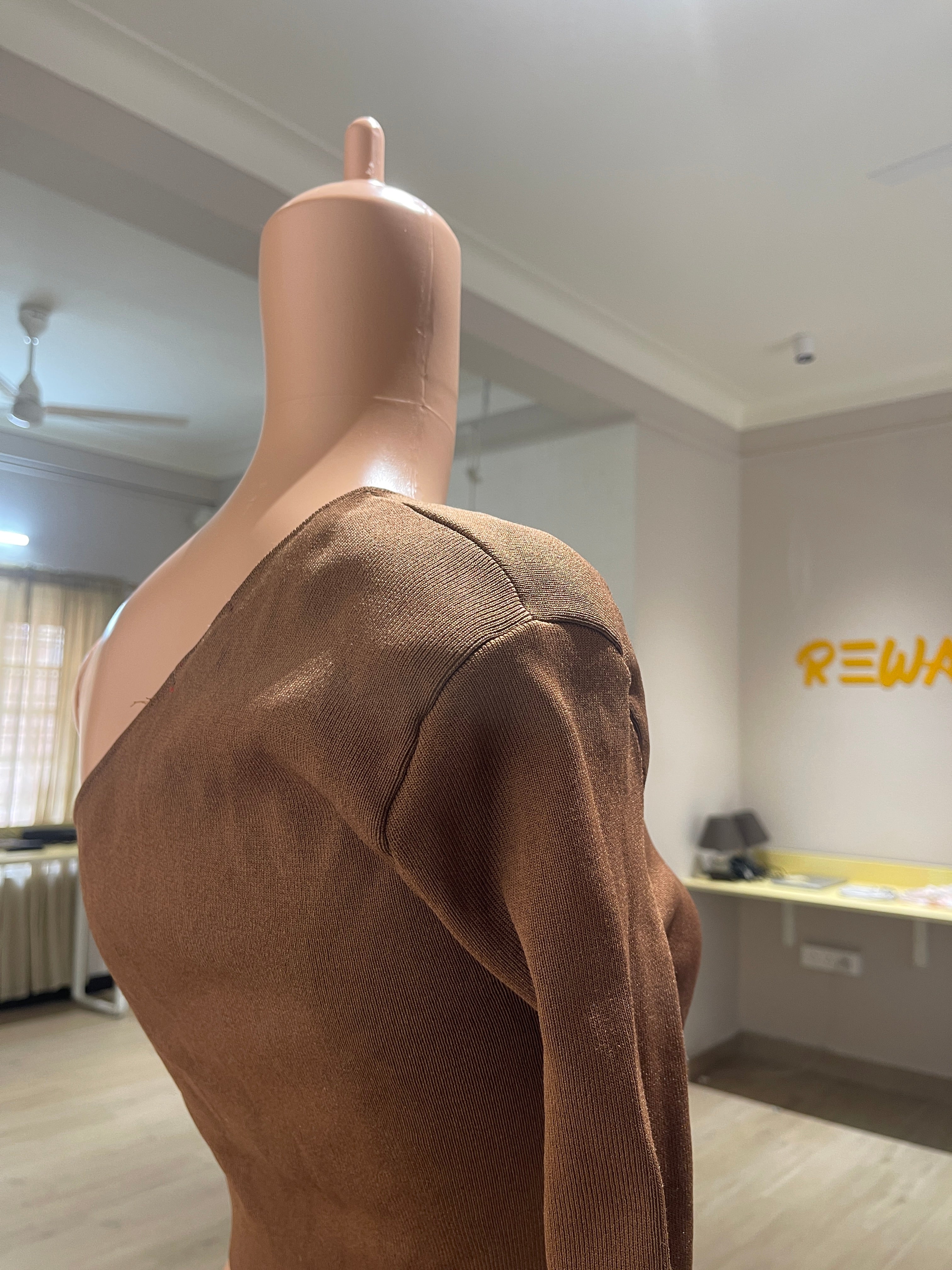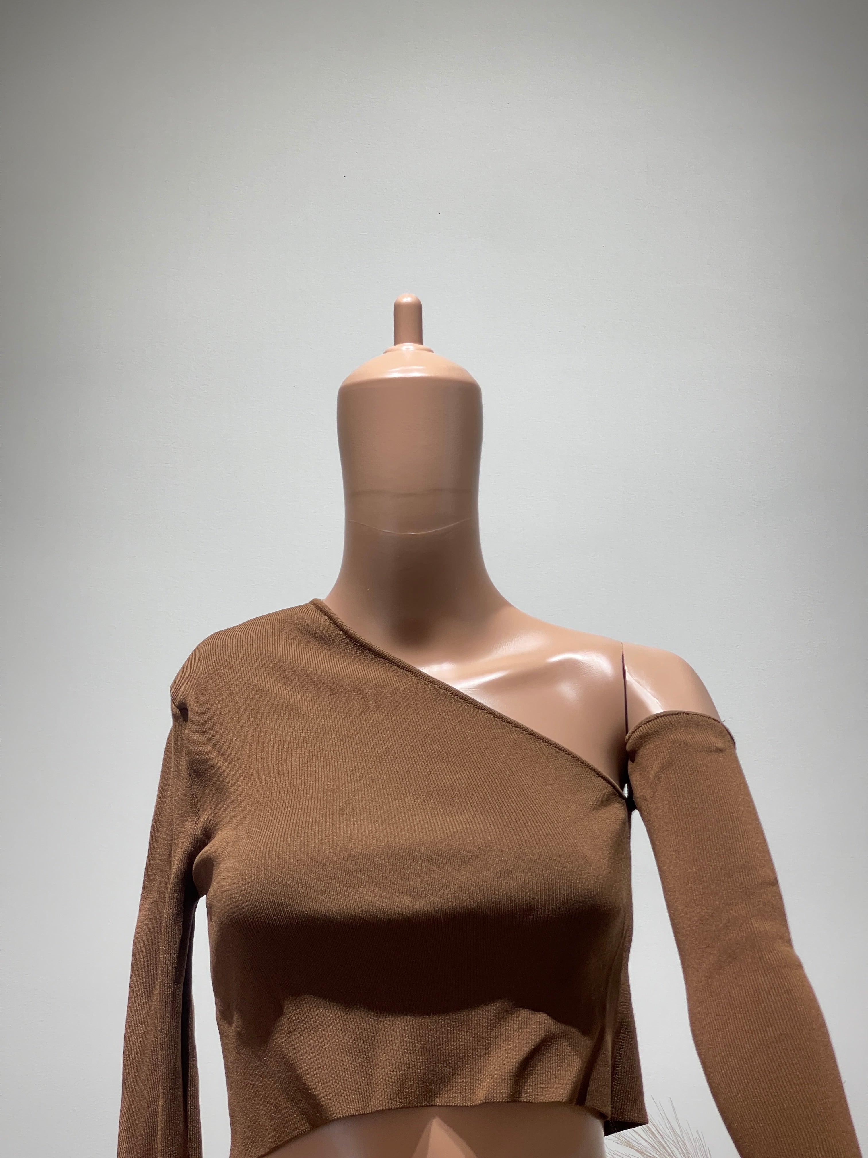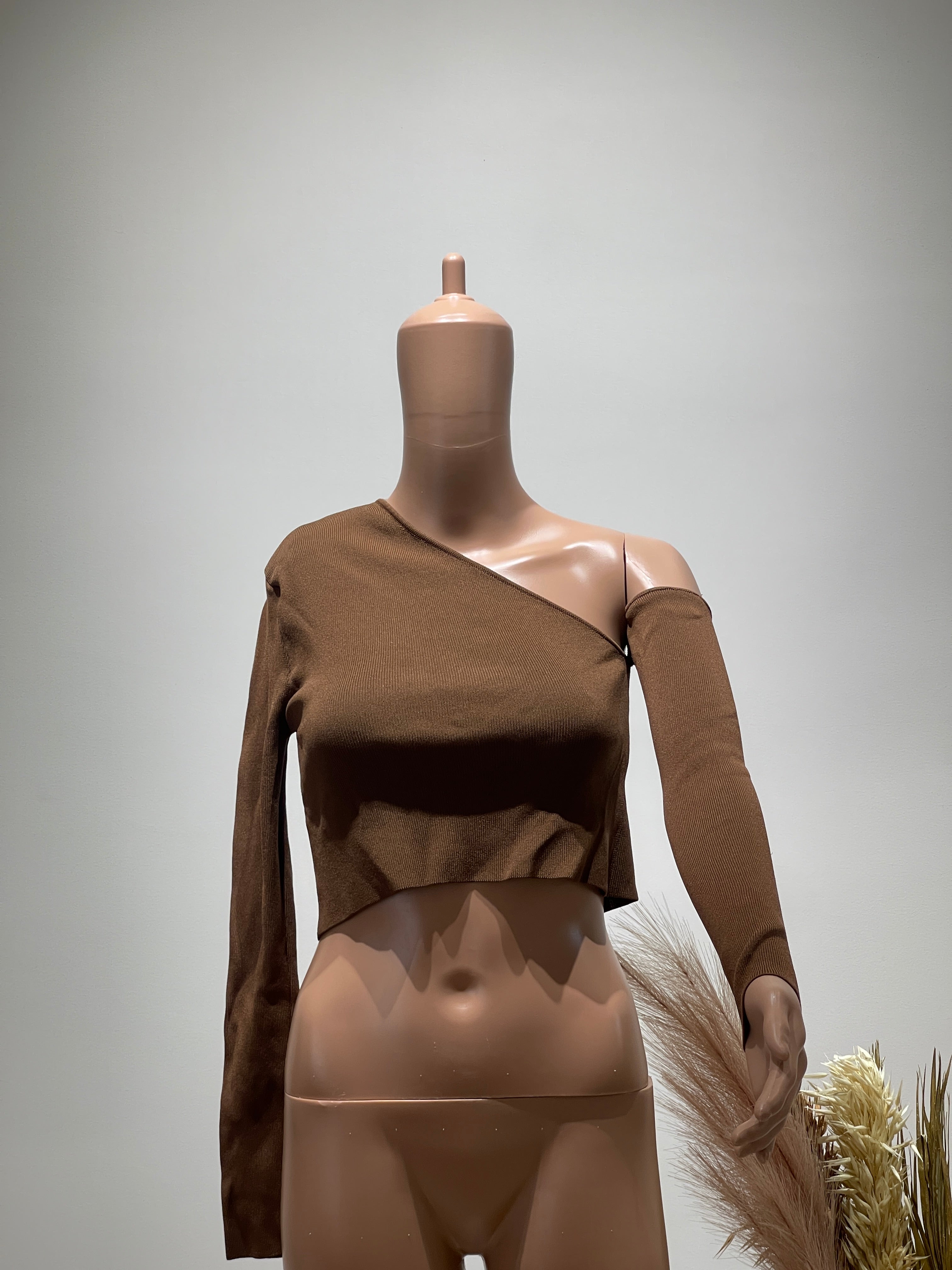 A trendy brown women's top with a casual fit and chic one-shoulder sleeve design for a modern, stylish look Chest...